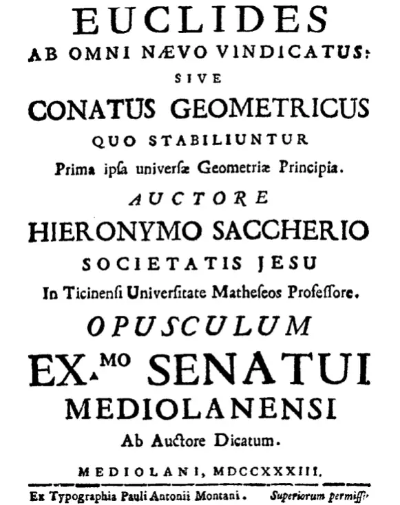 在19世纪前,“几何学”基本就等于“欧式几何公理”,而后者又是“空间应该长什么样”的明确结构问题的刻画。这种思想在当时的学者心目中非常根深蒂固[3],以至于意大利数学家Giovanni Girolamo Saccheri(1667-1733)在人生末期发表的_Euclides ab omni naevo vindicatus (《除去瑕疵的欧几里得》)_中,在尝试以反证法论证平行公设成立时,先是假设平行公设不成立(其中三角形内角和小于180度的特例),然后推导出了许多如今是双曲几何定理的命题,基本上足够建立起一个双曲几何的理论体系。然而他最终的做法是宣告这些所证得的命题“跟直线的本质深刻矛盾,所以绝对是假的”,从而完成反证法。